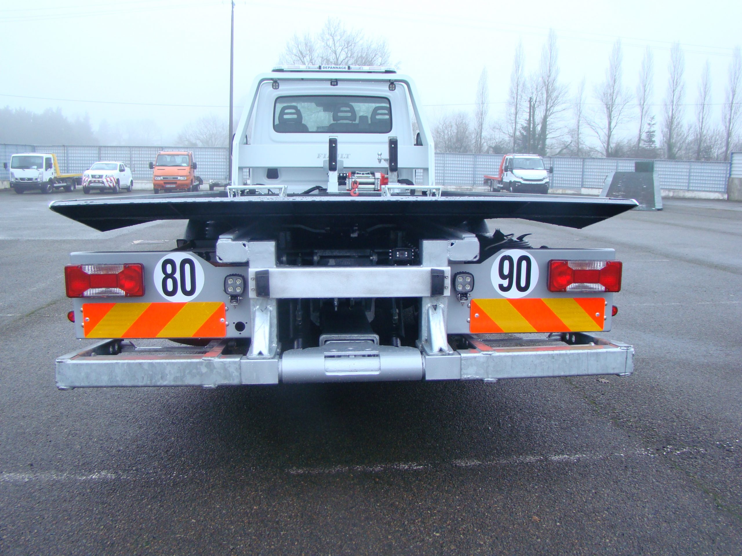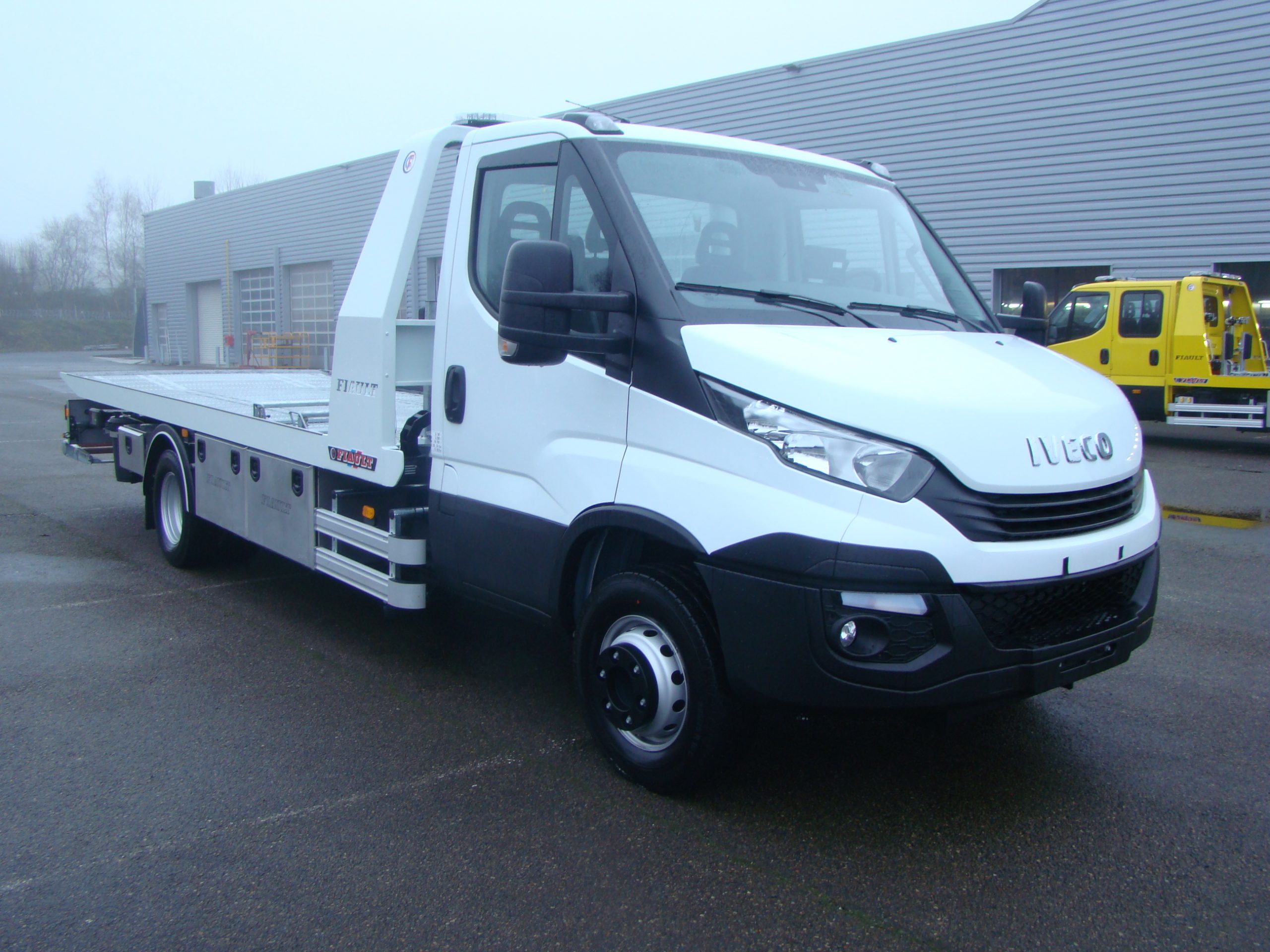 PLAT’TRANS PF30 NEUF en acier sur Iveco Daily 7T2, cabine courte, porte-voiture basculant et coulissant en acier. Circuit hydraulique avec pompe à grand débit, vérins à double effet avec clapets de sécurité. Treuil hydraulique de 3,6T, commande radio pour treuil et plateau.