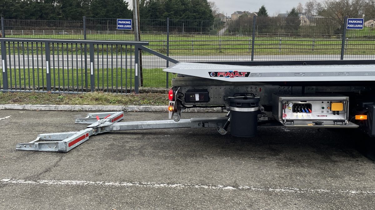 PLAT’TRANS PF60 en acier sur châssis MERCEDES ATEGO. Porte-voiture basculant et coulissant avec plateforme anti-dérapante. Plateau sur glissières acier galvanisées, hydraulique avec pompe grand débit, vérins à double effet avec clapets de sécurité. Béquilles arrières réglables, treuil hydraulique fixe de 4,5T.
