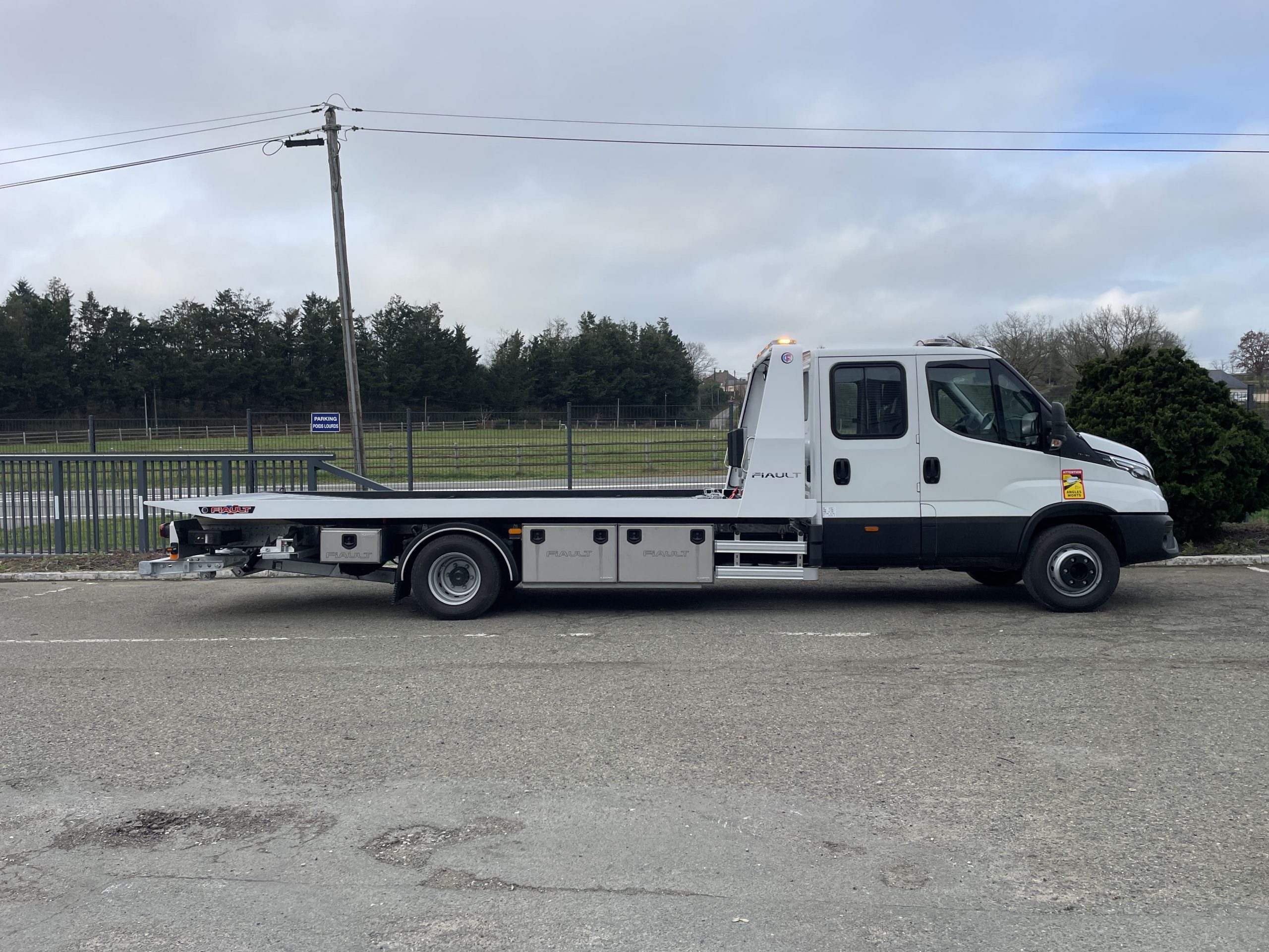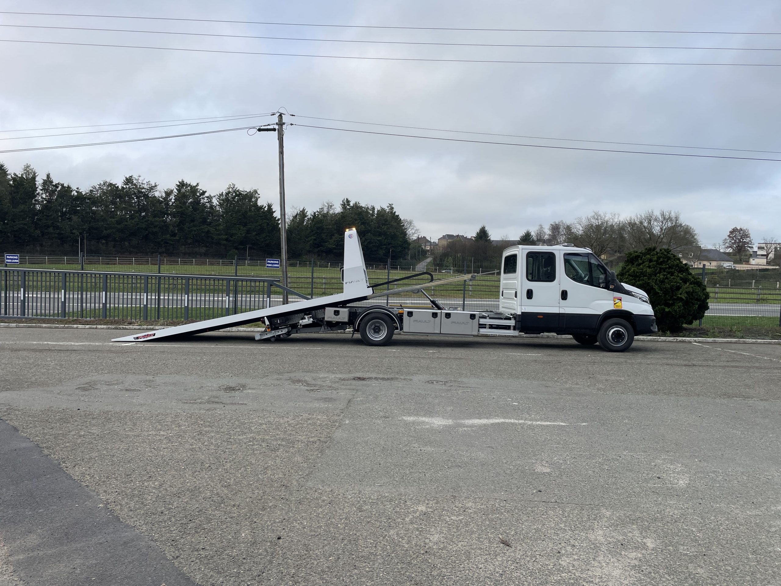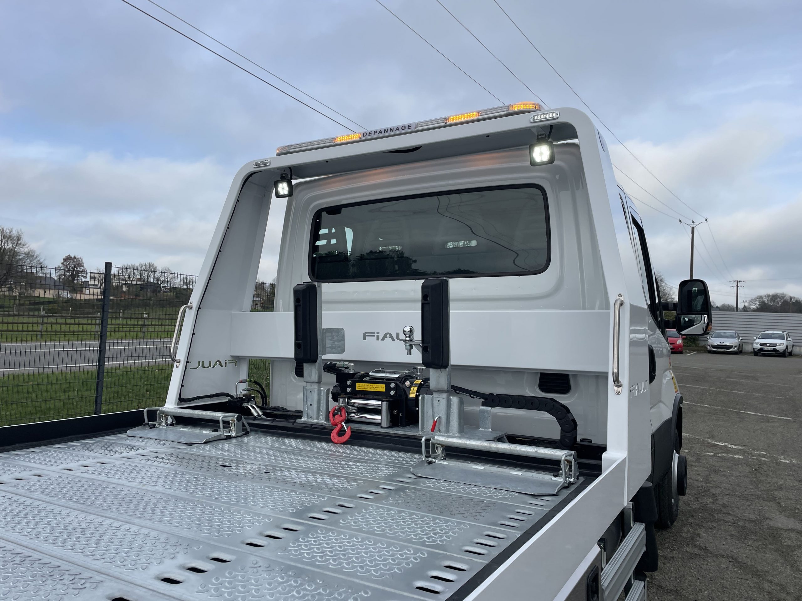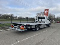 PLAT’TRANS PF30 NEUF en acier sur Iveco Daily 7T2, cabine double, porte-voiture basculant et coulissant en acier. Circuit hydraulique avec pompe à grand débit, vérins à double effet avec clapets de sécurité. Treuil hydraulique de 3,6T, commande radio pour treuil et plateau.